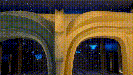超级视角:置身局外,将时间宏观划分为“过去—现在—未来”,引导观众跨越千年时空,穿越维度。如策展人所述,借助超级视角,观众可以回溯到数千年前,沉浸式感受古蜀先民的精神世界。“皎皎日星”单元是展览的视觉与情感核心,是古蜀人宇宙观与信仰的整体呈现,通过12K超高清裸眼3D沉浸式影像,将观众带入古蜀文明的时空叙事。此单元以四幕结构展开,对应“天地—自然—人神—古今”四个层次。