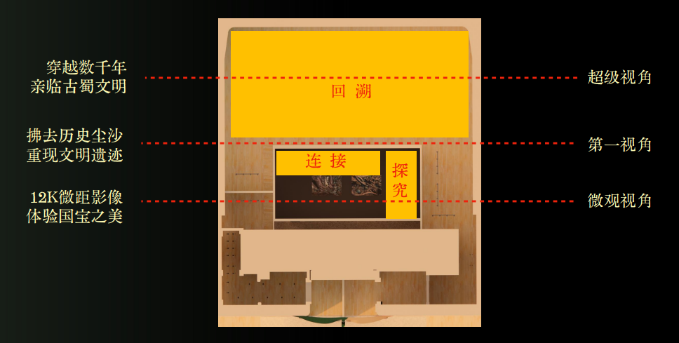 “我们提出了第一个核心概念——超级视角,总的时间维度包含过去、现在与未来。借助超级视角,观众可以回溯到数千年前,沉浸式感受古蜀先民的精神世界。这就像当下流行的穿越小说、穿越剧,能让观众置身于原本无法触及的历史时空,带来强烈的情感共鸣。”——策展人王泊乔