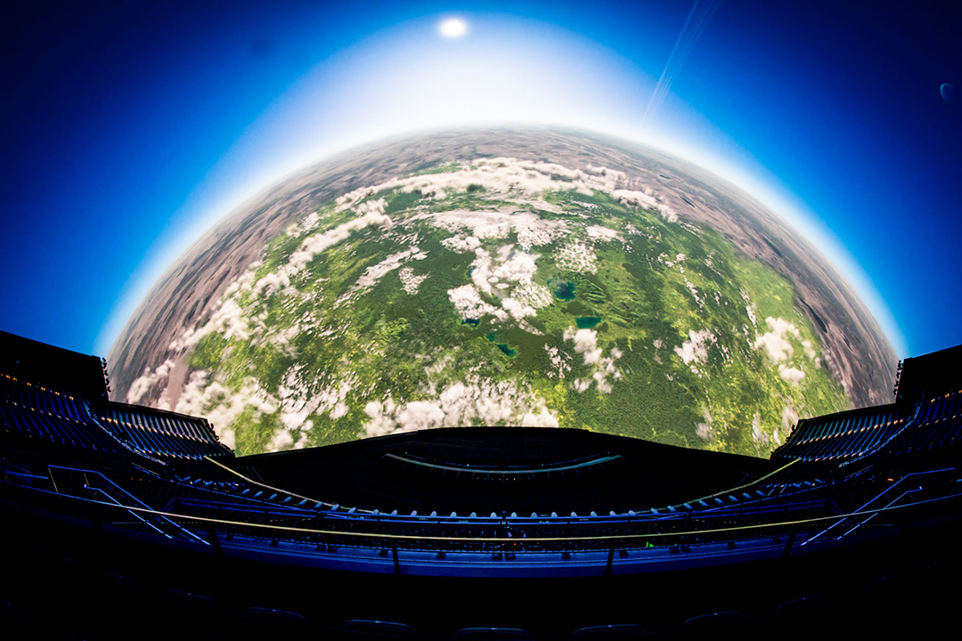 这一技术效果在Sphere官方发布的一张内部渲染图中得到形象说明:约18000名观众仿佛置身于幽深蔚蓝的海底洞穴,四周360°环绕的巨幅屏幕和精确投射的声音让原本存在的剧场空间仿佛“隐形”消失。整个空间犹如一座超大型天文馆(其规模远远超过传统只能容纳数百人的穹顶剧场),观众完全被影像与声场构建的世界所包围。在这样的环境中,即使中央舞台和真人表演者也显得渺小,仿佛只是宏大视听场景中的一个元素。这一幕生动展示了Sphere的显示系统与音响系统融合所开创的沉浸体验新维度:对于观众来说,他们所获得的不再是一场传统意义上的演出,而是进入了一个全新的感知“场域”。
