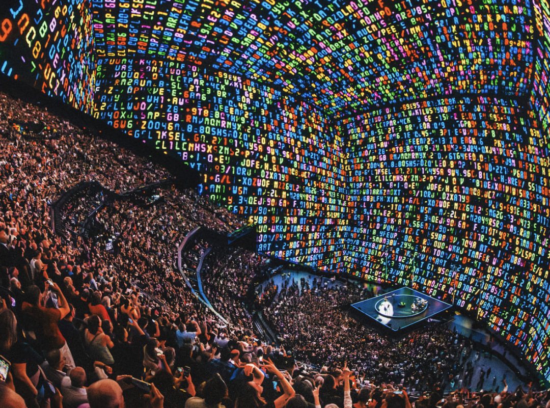 Sphere剧场最引人注目的特色之一是其建筑结构与显示技术的深度融合。整个球体的“外壳”(Exosphere)由约120万个圆形LED模块拼装而成,显示总面积接近58万平方英尺,能够呈现超过25亿种色彩,已成为拉斯维加斯极为醒目的数字景观。剧场内部,观众席上方的穹顶区域覆盖着约16万平方英尺的巨型环形LED内屏幕,垂直高度近120米,几乎将整个室内空间包围其中。这块内屏幕分辨率高达近16K,堪称目前全球最清晰的室内显示屏之一。如此庞大的双层屏幕系统需要强大的计算能力支撑:Sphere内部部署了约150台高性能图形处理单元(GPU)用于驱动屏幕,并配备高速存储和网络,以保障海量影像数据的实时传输。这意味着,Sphere剧场的建筑表皮与室内空间实际上被转化为一个360°环绕的巨型屏幕介质,物理结构与数字内容真正融为一体。