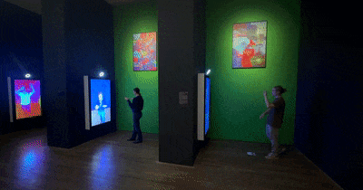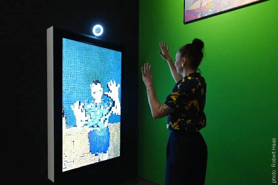 一旦一个人站在上面装有摄像头的电子屏幕前,他们的虚拟剪影就会被实时解构成数千个多色多边形,直到变成几乎无法辨认的自画像。