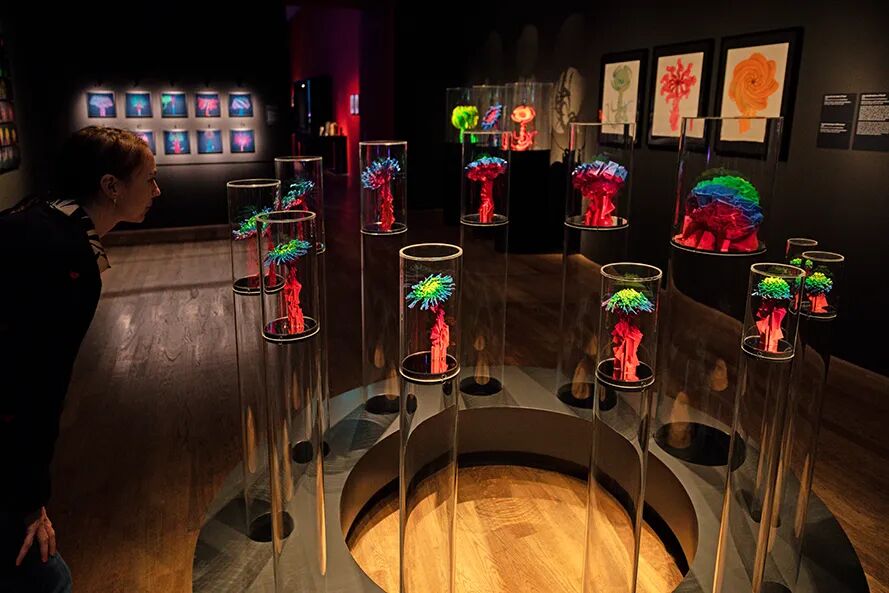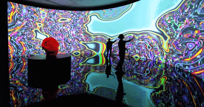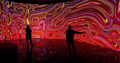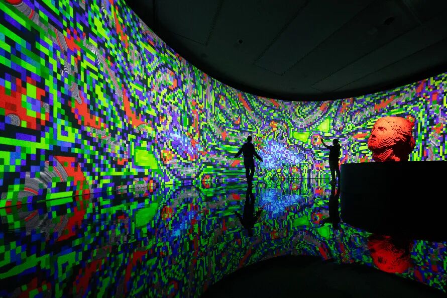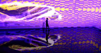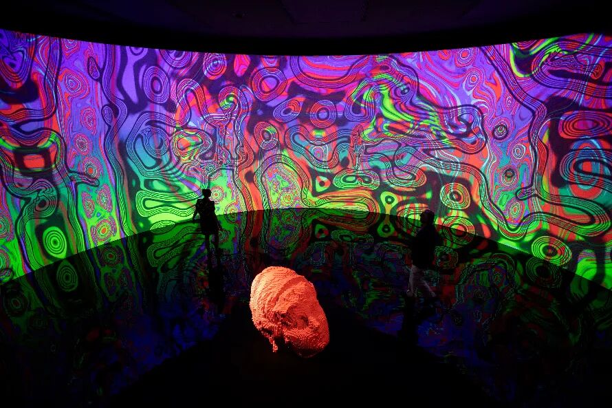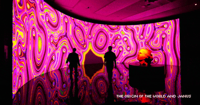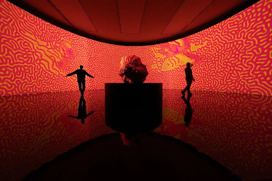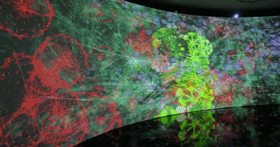 宽广的虚拟现实装置《The Origin of the World》将数字投影投到高耸的弧形墙,使游客沉浸其中来了解生物世界的最基本构成:微生物和细胞。