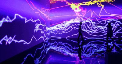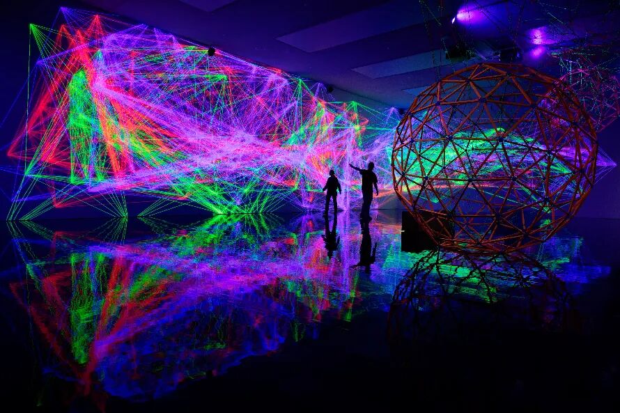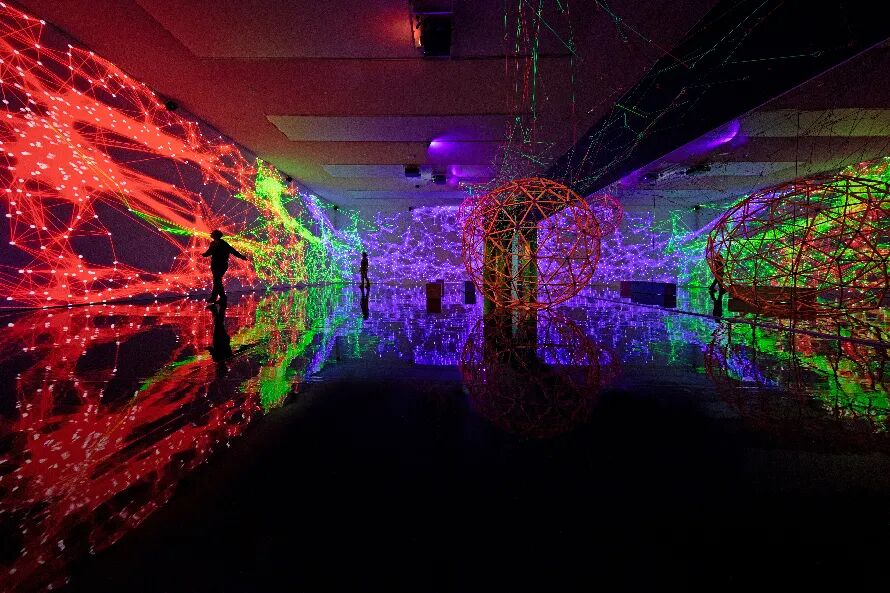 散发着活力的流动空间里,所有东西都是浮动的、伸枝散叶的,它们经由交织的多重彩色光线、分层网络和各种通路变幻为其它形态。而元素之间相互吸引又互相排斥,如呼吸一般膨胀、收缩。