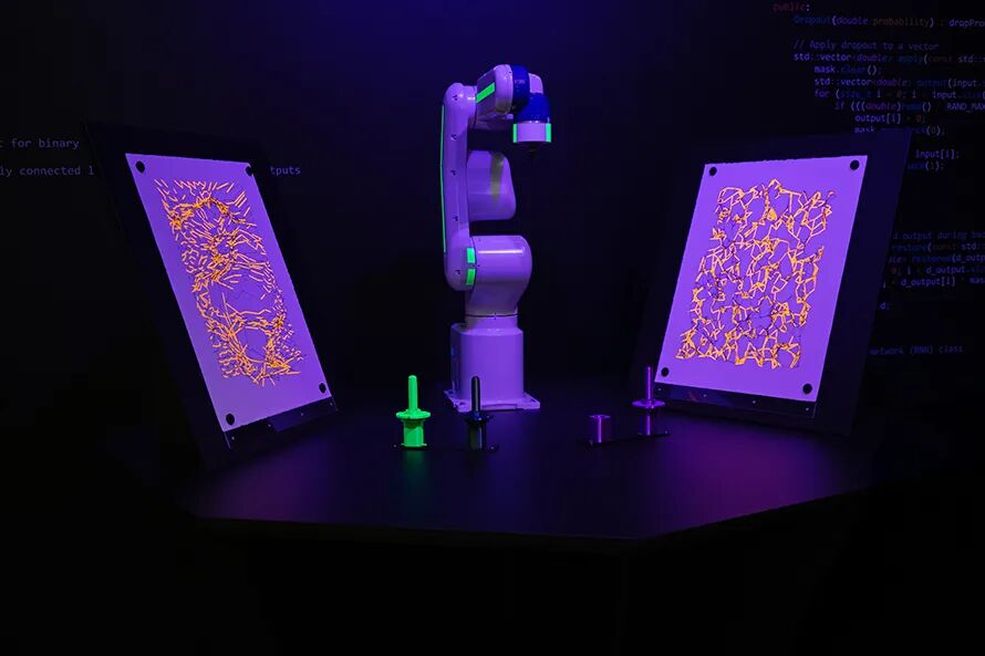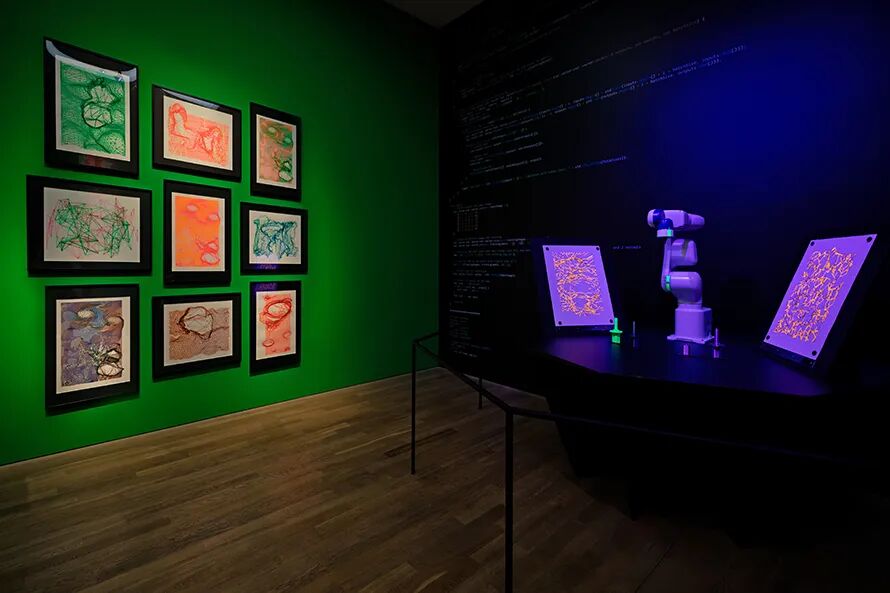 展览涵盖多种媒介和形式,例如用陶瓷和再生塑料制成的3D打印雕塑、机器人生成的绘画、机器刺绣和挂毯,以及运用人工智能创作的影像作品。大型生成式互动装置是展览的核心组成部分。