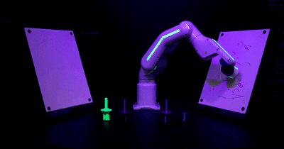 艺术家通过选择纸张和绘画工具来设定参数,而机器人则负责绘制线条。这套机器人系统最初是为工业重复作业而设计的,如今经过重新编程,能够创作出变化多端、类似手势的绘画作品,从而凸显程序化动作与手绘表达之间的转换关系。