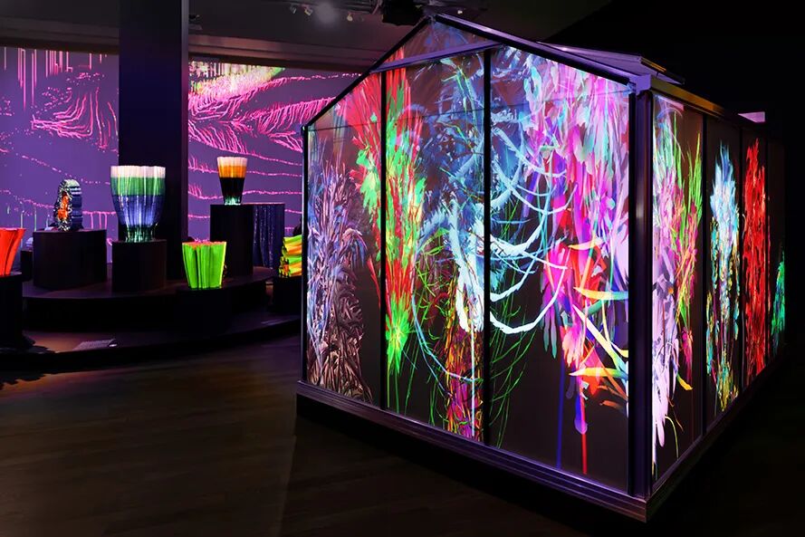 第二部新作品《In Vitro Pixel Flowers》扩展了 Chevalier 对数字植物系统的持续探索。该装置展示了他迄今为止最大的虚拟植物标本馆,允许游客通过在线界面生成植物形态,并在类似温室的环境中观察它们的发育。
