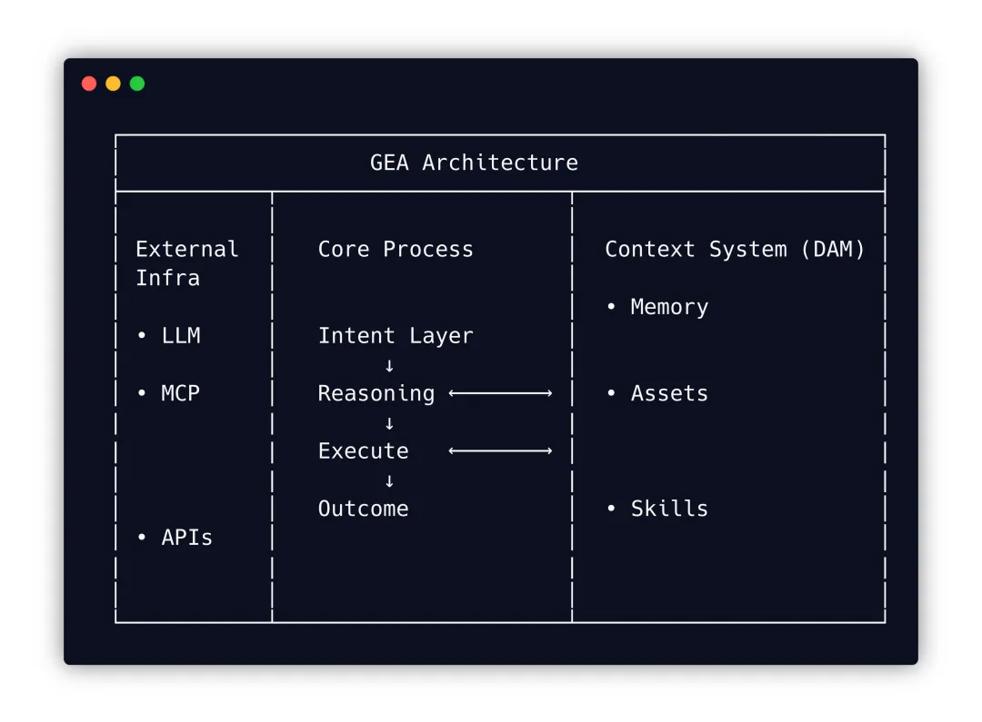 我们把这种面向企业长期运行、强调主动介入、以推理作为行动前置、并依赖长期上下文与可复用能力的 agent 架构,称为 GEA(Generative Enterprise Agent)。
