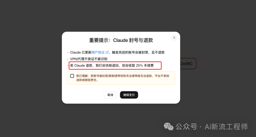 简单来说就是如果你的Claude 封号了,但是给你发了退款邮件,你可以直接联系wildAI的工作人员进行退款处理,但是平台会收取25%的手续费。