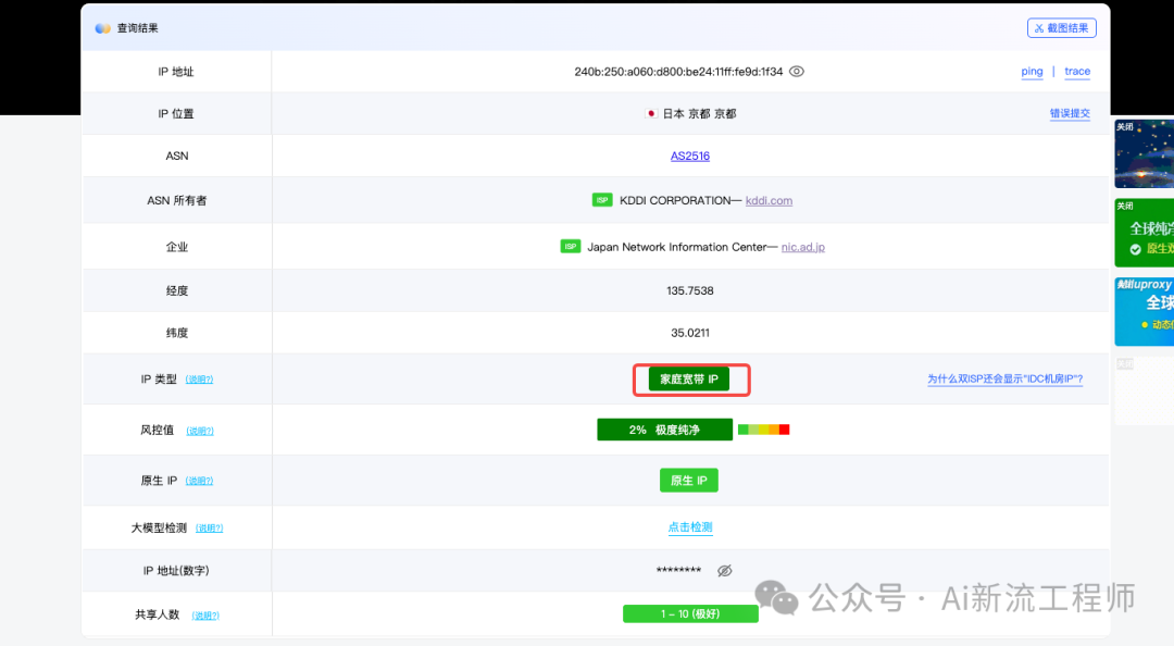 大家可以简单测试一下自己的网络,大家可自行使用网络IP检测工具确认IP类型,建议选择主流可信平台。