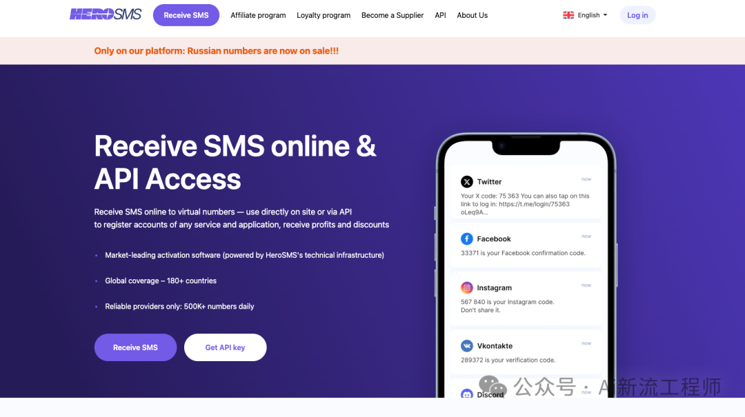 如果需要手机号验证的话,系统让你输入手机号,打开hero-sms登录账户。