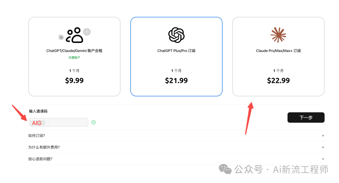 传送门:我们选择Claude服务即可,注意,在使用的时候会让你填写邀请码,你可以填写「AIG」。