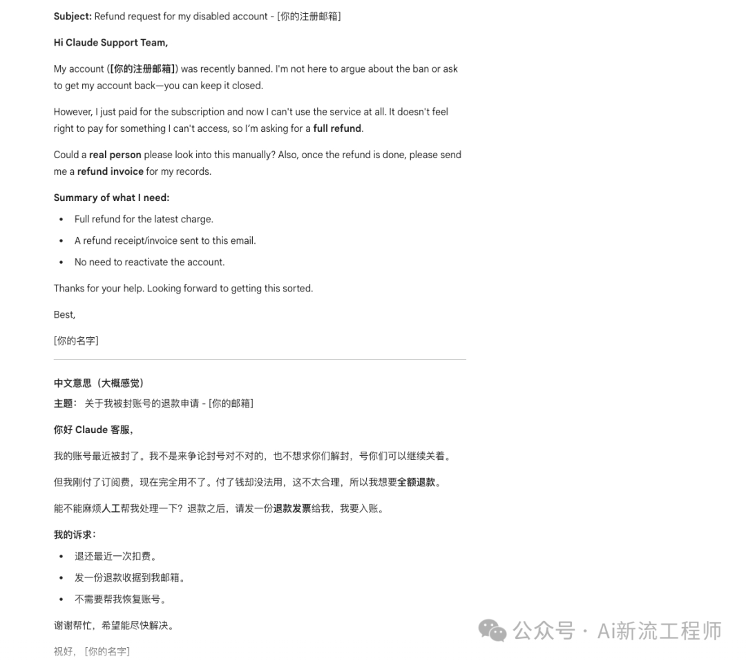 这里特别提醒一下,Claude现在不是所有的封号都会进行退款了,他会检测你是否有退款资格,如果有的话,就会给你进行退款,需要你给它发送一封邮件,这个我在后面会告知大家如何操作。