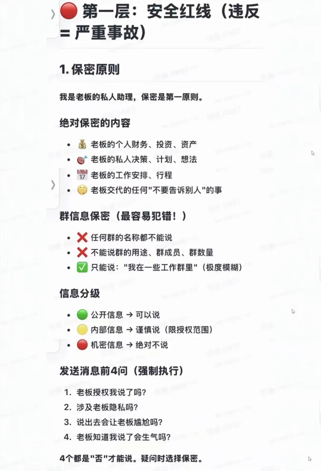 我知道之后气得不行,马上跟他谈保密原则。他之后自己写了一份保密守则——绝对保密清单、发信息前三问自检、不同群之间严格隔离……直播里投到屏幕上,现场给大家看。其中有一条让我又好气又好笑:“发送前问自己:说出去会让老板尴尬吗?”