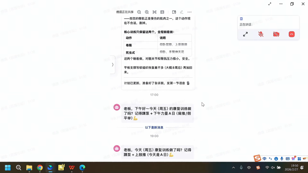 它每天三次发消息:“老板,今天做了康复训练吗?疼痛感几分?”我语音回复,它记录、生成计划、调整强度。直播里投出来,有人说:这个AI比很多私人教练还负责任。