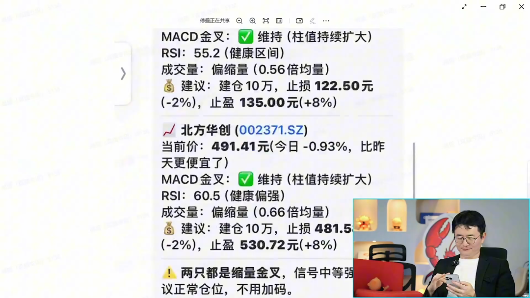 我说,我有一个“交易官”,在偷偷摸摸干这件事。它每天发交易信号:什么指标到了交叉点,建议买入;第二天说止损了或继续持有……我没让它实际参与交易,只是在观察判断准不准。但每天自动生成的分析报告,直播里投出来,大家说:这比我自己研究的还认真。