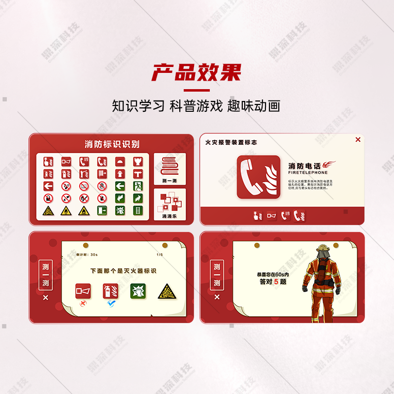 当体验者按下屏幕上的标识图案,对应的灯箱标识就会亮起,让体验者认识学习。而屏幕中则会出现该标识的具体含义及一个趣味的科普动画,从而将知识传递科普,大大提升了体验者的学习兴趣。此外,系统包含发生警报器、安全出口、逃生梯、灭火设备、消防水泵接合器、火灾报警装置等三十个消防标识内容,这将是一次丰富且全面的知识学习体验。