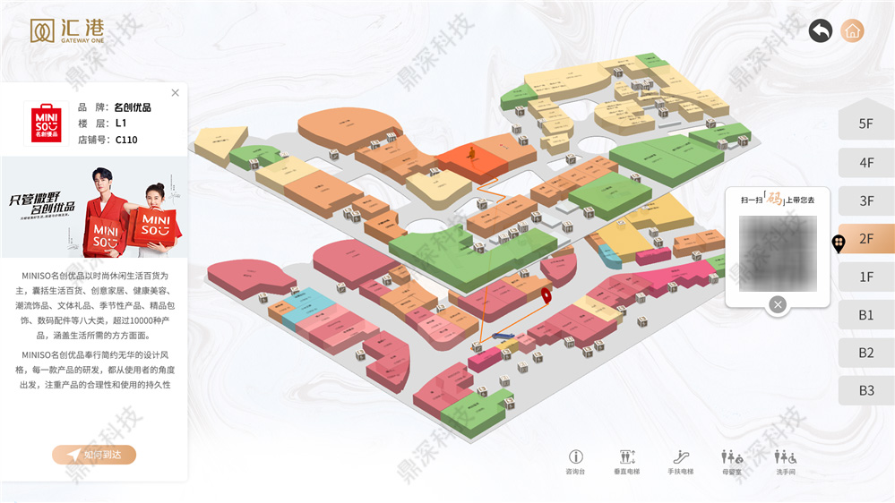 智能导航导览系统,一款为了满足现代导航导览需求而研发的大型场所室内导航定位工具,通过蓝牙定位、触摸屏展示、3D地图模型等提供智能导航指引服务。它不仅能满足大众对导航的需求,还提供智能化的互动体验,还有大量的展示内容,如店铺活动、周边交通信息、商场简介等,让体验者能清晰了解该场所信息。