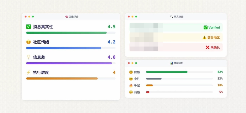 每一个选题,都有消息真实性、社区情绪、信息差、执行难度四个维度的打分。