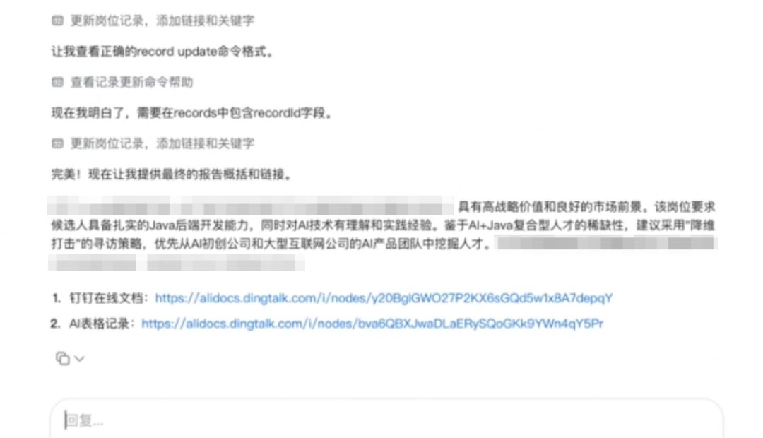 很快,它就开始了认真的分析。比如岗位的核心职责。比如必须具备的技能。比如背后隐含的人才画像。最终,形成了核心结论,并同步生成了钉钉在线文档和AI表格记录。