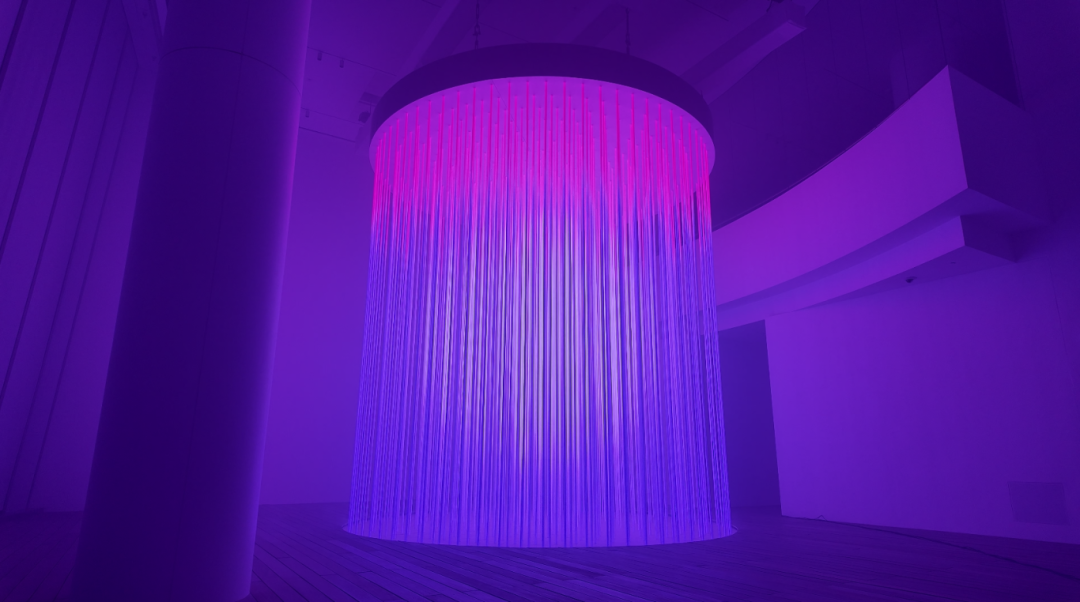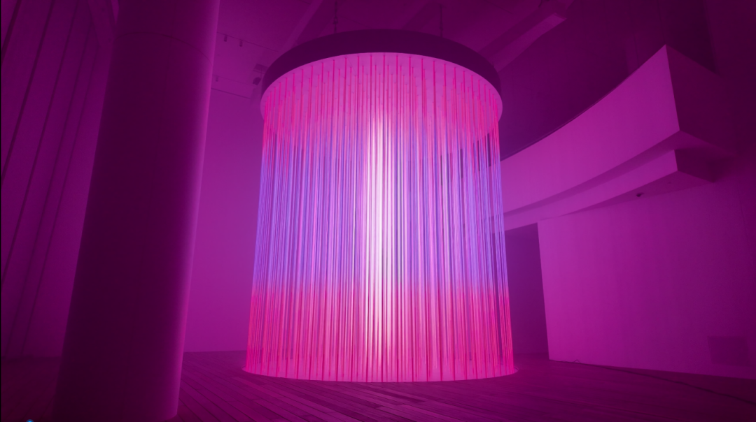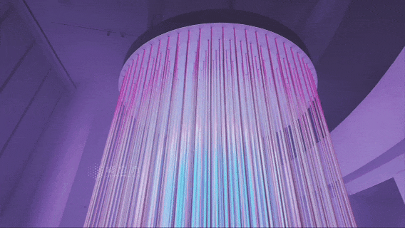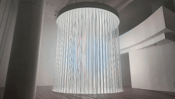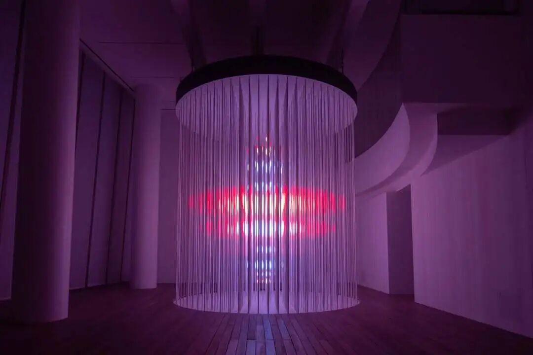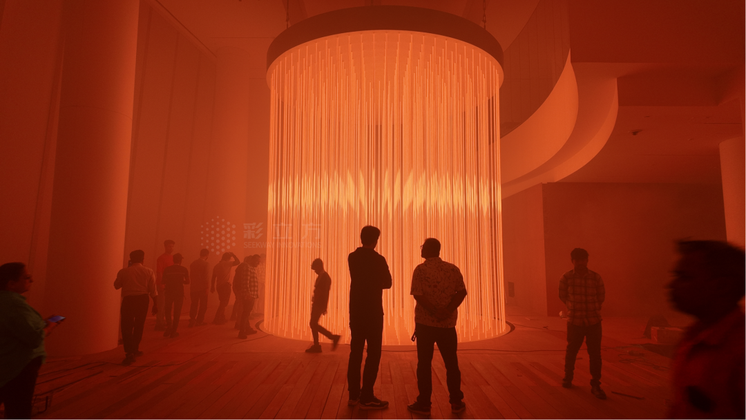 在孟买 Nita Mukesh Ambani文化中心艺术空间(以下简称:NMACC)——这座顶级标杆性综合文化地标里,一场名为Doug Aitken: UNDER THE SUN的展览正在进行。展厅中央,一座悬挂数百条LED管的巨型圆柱灯光雕塑(高6米直径6米),正在绽放未来之光。