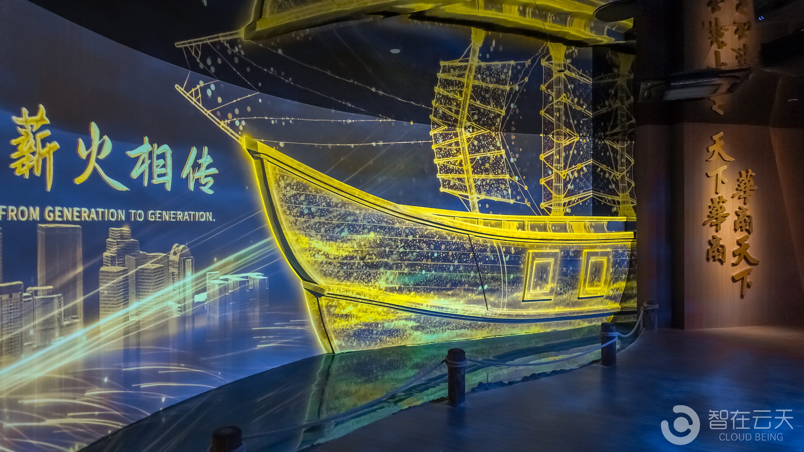 在广州华商学院世界华商博览馆的“启航”序厅内,智在云天将华商群体的奋斗历程化为可步入的沉浸式视听空间,让千年商路重新苏醒。