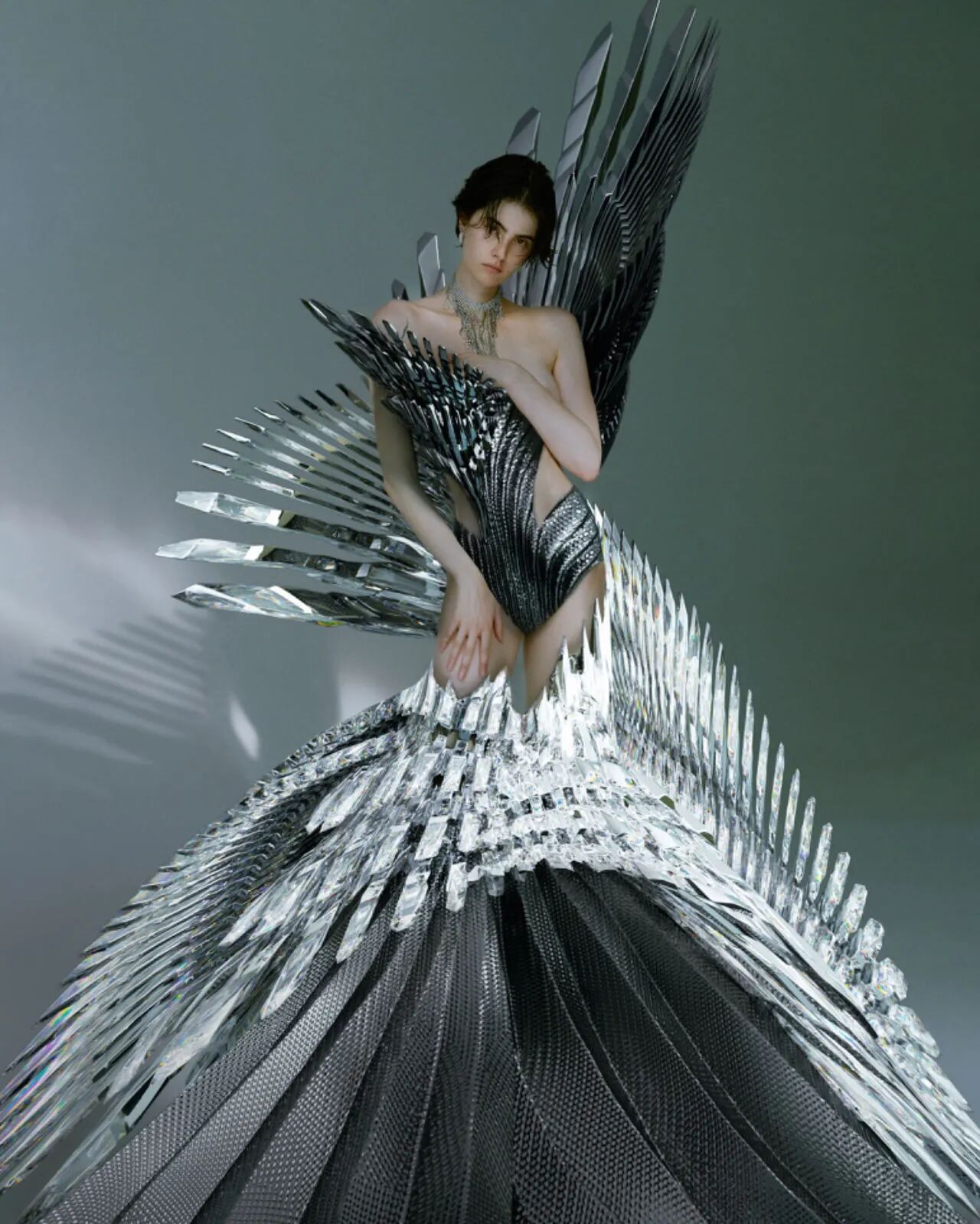 有趣的是,她的日常穿搭风格与数字作品中的“华丽、夸张、强张力”形成了鲜明反差。她几乎只穿裙子,偏爱立裁结构丰富、层次分明但视觉连贯的纯黑或纯白套装,始终保持着一种低调的美学。“我的数字作品是外放的,是放大想象力的;但我本人更喜欢低调一点、收一点。”