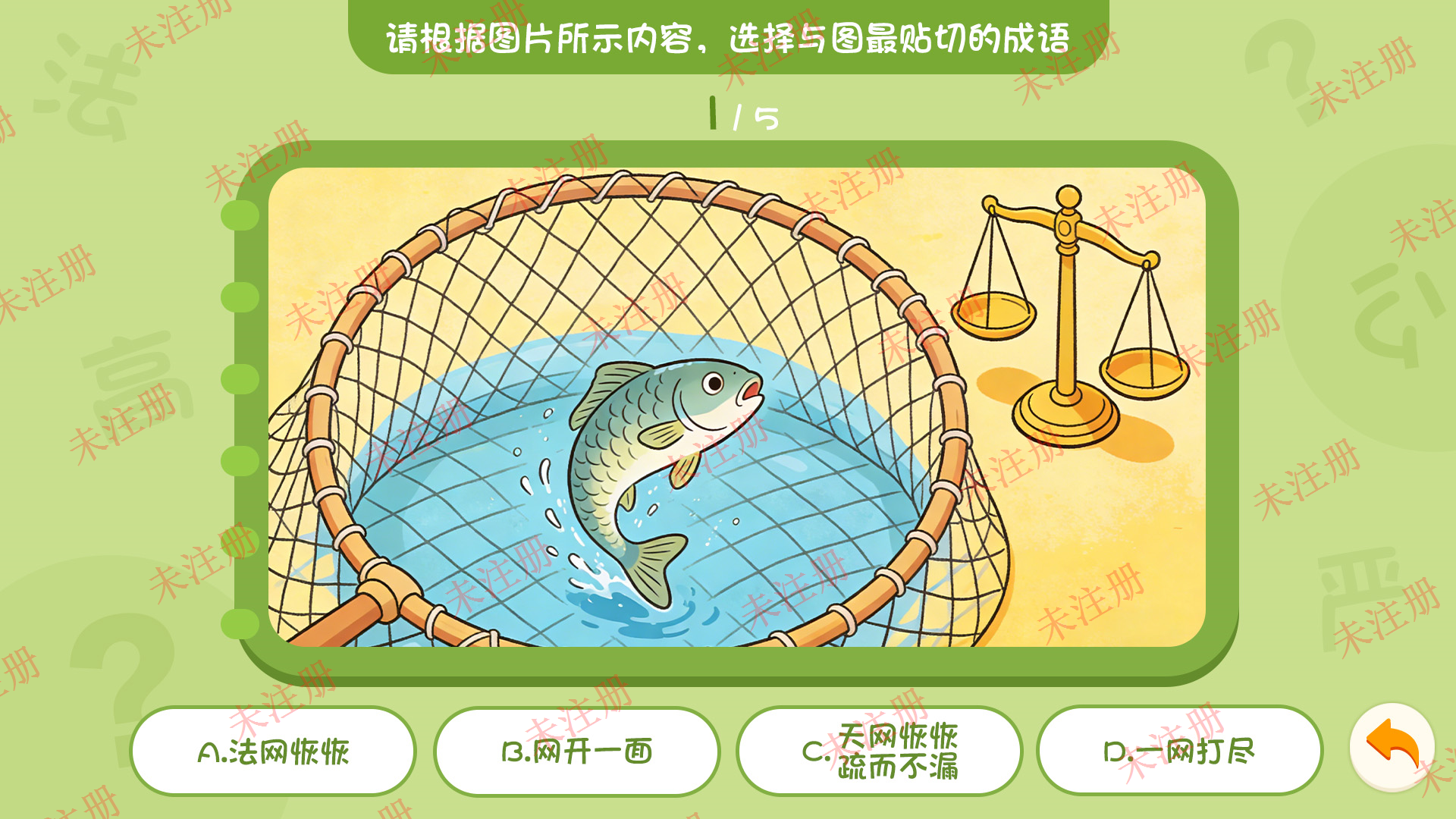 进入法治成语猜猜猜互动软件首页后,用户可直接看到清晰的答题界面。选择“看图猜成语”模块,一幅幅生动画面便跃然眼前——从“铁面无私”到“秉公执法”,每张图都暗藏法治智慧。用户只需按照提示选择答案,提交后系统将自动弹出“回答正确”或“回答错误”的即时反馈,并附带详细成语释义。这种设计不仅增强了学习趣味性,更帮助用户理解成语背后的法治内涵。