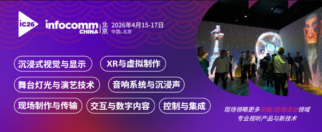 从探索到引领,北京 InfoComm China深耕专业视听领域二十载。今年展会将于2026年4月15-17日在北京的国家会议中心举办,届时这里将汇聚全球领先沉浸式技术与集成解决方案品牌——涵盖5D系列智能交互屏、直播相机、激光投影仪、先进LED显示屏、虚拟仿真解决方案、沉浸声解决方案、沉浸式互动空间、AI数字人等创新产品及技术。为文娱领域人士提供一站式平台,助力其将空间转化为令人难忘的沉浸式体验。