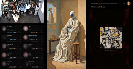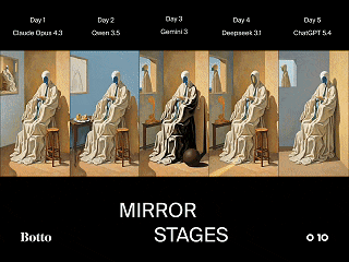 作品标题借用了雅克·拉康的“镜像阶段”理论:身份通过遭遇自身镜像而形成。在这里,Botto观察观众,观众也观察着Botto。每一场创作从一个由社区投票选出的“种子图像”出发,在两小时的生成周期中,Botto通过摄像头读取现场观众的表情与姿态,这些反馈会触发它内部的多个AI代理进行“商议”,共同决定图像的演化方向。