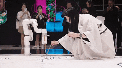 Sougwen Chung 的《RECURSIONS 递归》是一件十米长的书法卷轴,但它的创作使用的不是传统笔墨,而是脑波接口、化学墨水系统和生物信号。由艺术家数十年肢体动作与生物传感器数据训练而成的动态机器人,在巨大卷轴上实时延伸她的笔触。