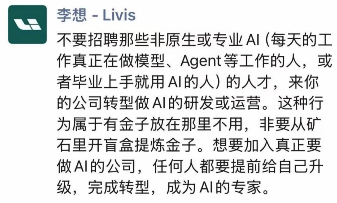 - 李想谈对 AI 人才招聘看法:别招非原生非专业的