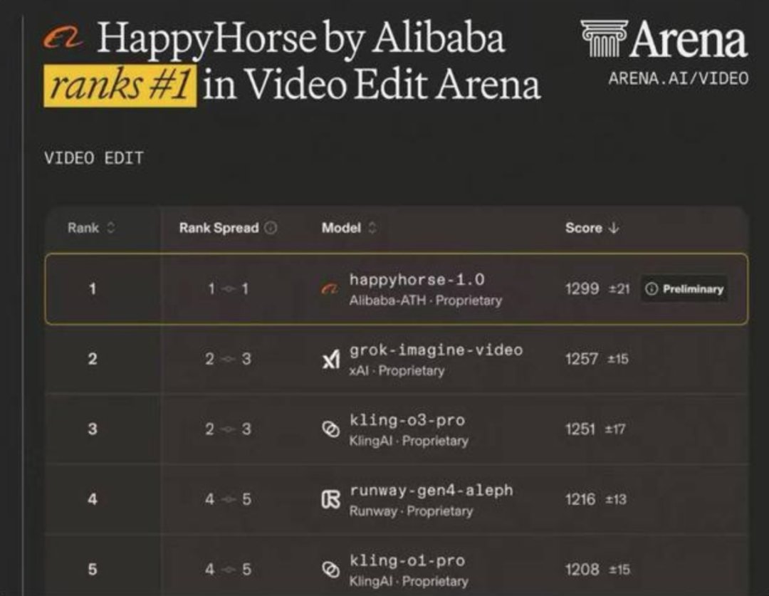 - 阿里巴巴 Happy Horse-1.0 登顶 Arena 盲测视频编辑榜