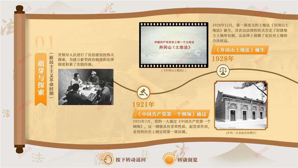 中国法治之路软件的诞生,为法治宣传教育带来了全新可能。用户无需复杂的操作,只需轻轻旋转旋钮,便可在时间轴的指引下依次浏览不同历史时期的法治内容。左旋或右旋,随心切换,自由探索百年法治进程中每一个关键节点——从《井冈山土地法》颁布,再到具有临时宪法性质的《共同纲领》面世,每一段法治历程都以图文、视频等形式生动呈现。再次按压旋钮,即可一键返回首页,操作直观便捷。