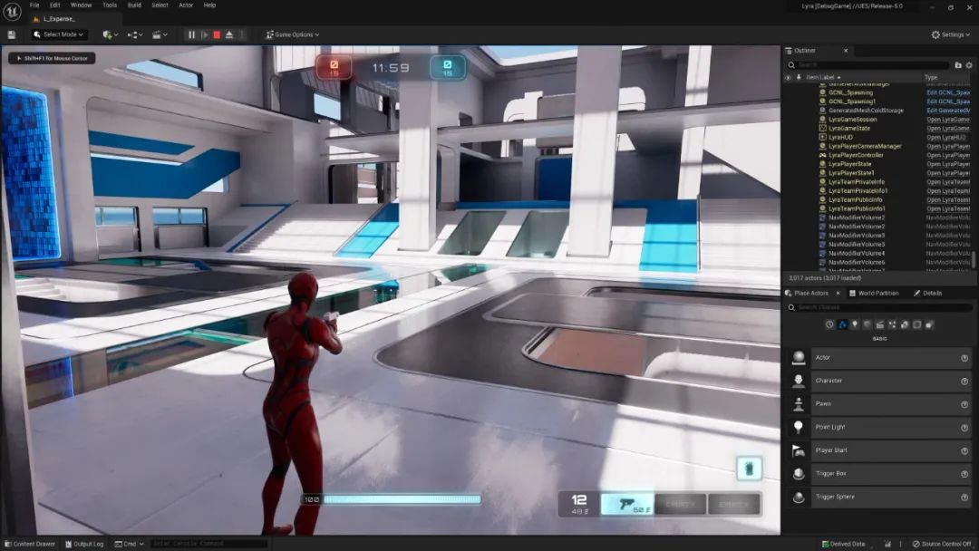在接下来的演示中,Zak Parrish向我们展示了Lyra这个项目的丰富内容。拥有3个关卡和模式:淘汰模式(类似于标准的死斗游戏);控制模式(类似于占点模式);还有爆破模式(类似于带排名的派对游戏)。Lyra这个项目完全基于UE5的全新功能打造,因此你能在里面看见Lumen动态全局光照的实时效果,也能利用Bridge把Megascans的资产导入进来。同时项目里还有丰富的程序化网格生成工具,让你可以灵活的创建调整你自己的关卡场景。当然,你也可以直接修改编写完善的模块化的蓝图脚本来创作你自己的游戏。