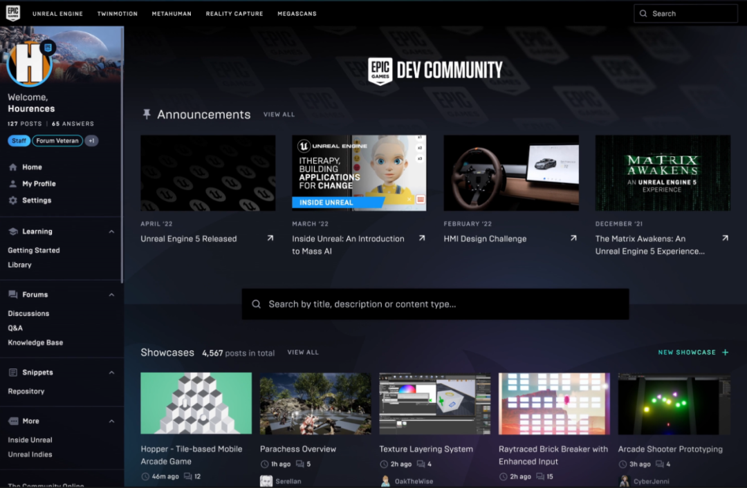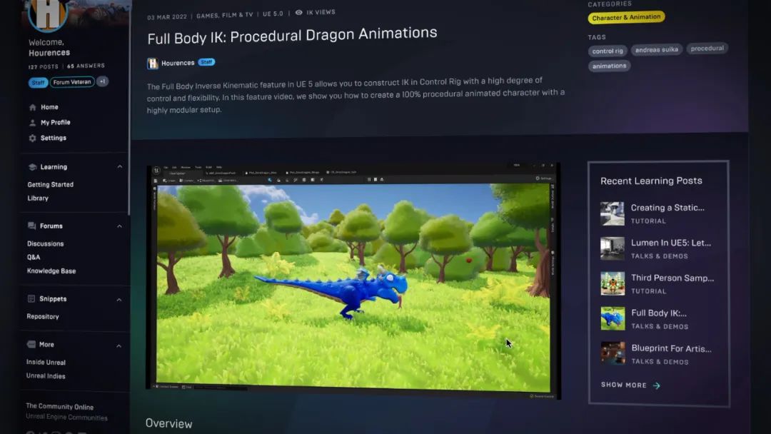 而且很关键的一点是,任何人都可以编写教程并提交到这个内容库。只要使用一个简单易用的教学编辑器,你就可以使用文档、图片、视频和代码工具建立自己的页面,和其他开发者快乐的分享你的知识。虚幻引擎论坛也已经整合完毕,大家可以在这里展示自己酷炫的项目,与其他开发者一同讨论,或者学习其他人的解决方案。