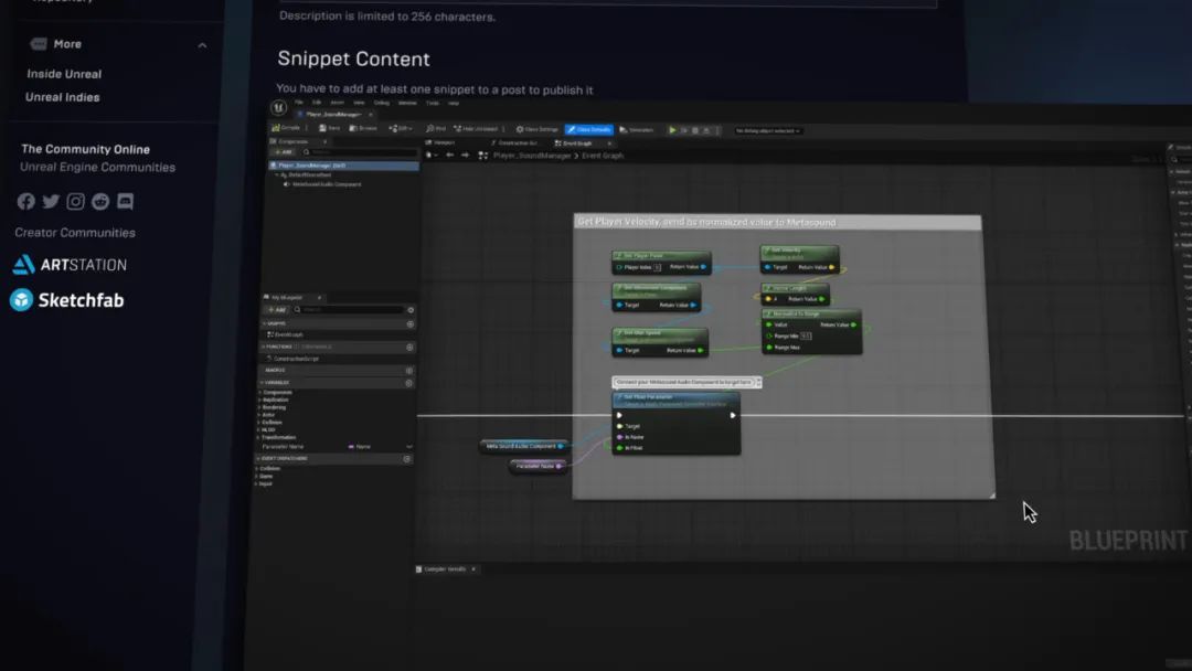 这里还有代码库,方便大家分享和保存代码段,例如C++和Python,或者基于文本的资产——例如蓝图、材质、Metasounds等等。你可以直接从虚幻编辑器中复制粘贴蓝图到网站的代码片段中,这样你就可以存储想要的内容并和他人分享你的成果。