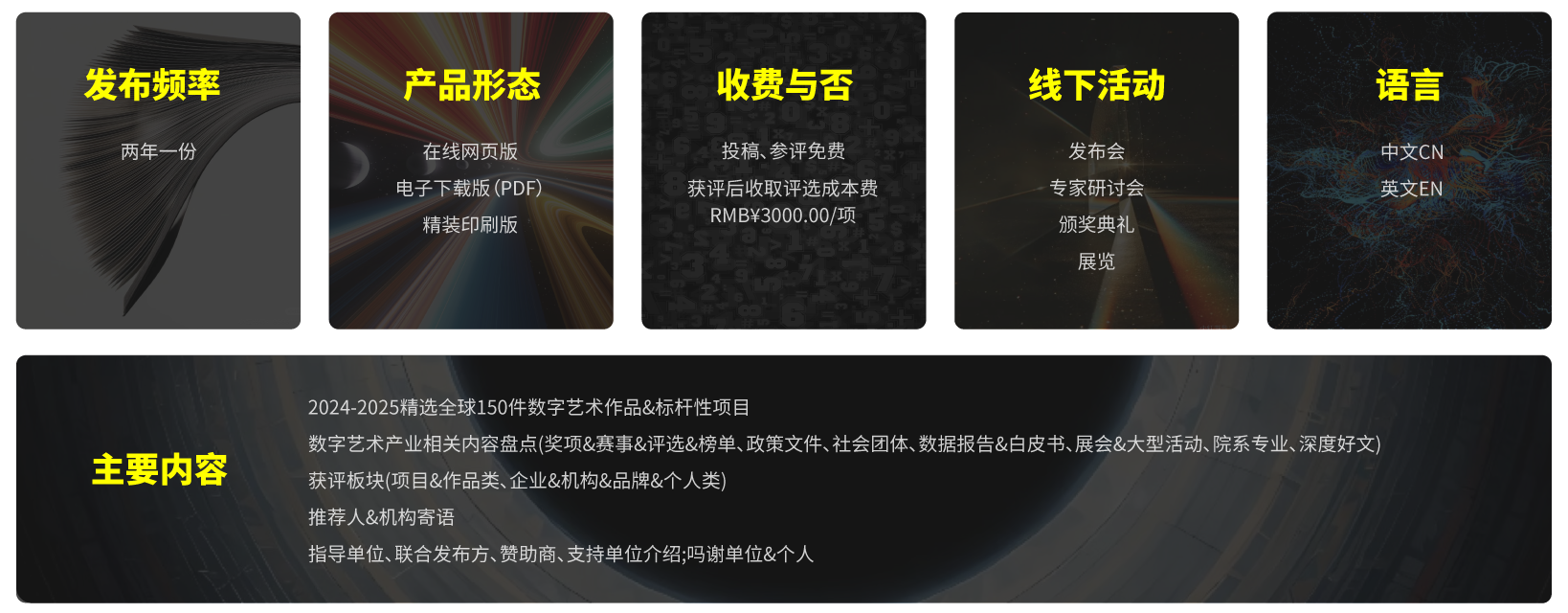 《COMART 国际数艺双年鉴》长期征集全球范围内优秀数字艺术作品、标杆性项目,以及数字艺术产业相关内容,包括奖项榜单、社会团体信息、展会活动资讯、院校专业介绍、数据报告、政策文件和深度文章等。每两年,我们将隆重推出电子版与印刷版的《COMART 国际数艺双年鉴:20XX - 20XX》。