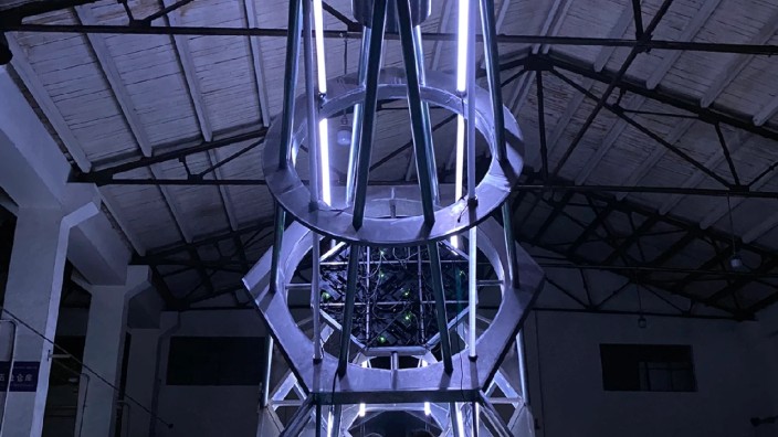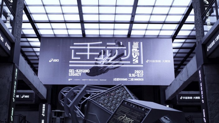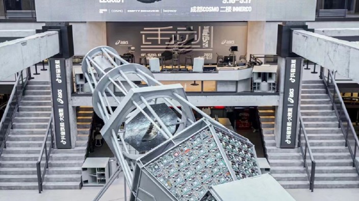 N-APE STUDIO顽猴以上世纪早期的天体望远镜为灵感原型进行复古再造,创作了重达3吨、具有时空寓意的三段式模块装置——重塑之界FROM THE UNIVERSE,庆祝ASICS亚瑟士GEL-KAYANO系列30周年的纪念。装置本体采用了Gel-Kayano Legacy的液态银喷镀配色,底部由六边形桁架构成,侧身融入鞋身的线条设计的DNA,底部与中段连接区通过旋转30°将两个六边形交错,中段由两个不同的尺寸的六边形桁架组合二层,整体呈倒台形,上部以管架结构为主,形成悬挑的锥形结构,将重塑之界的透视视线远端作为终点。通过装置,团队希望向外界传递传达出这样的理念:每个人都握有一把望远镜,记得调节视度手轮用它看宇宙看火山看远处,回望过去,看未来,也记得放下它的时候感受你的周围,请用不变的心态应对万变的挑战,也可以用万变的兴致应对不变的日常,自如的调节视度手轮切换视角保持新鲜。