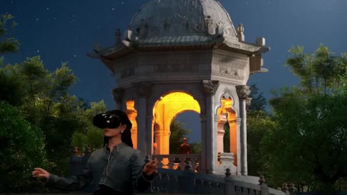 2025年春节前夕,现象级文旅VR大空间体验项目《梦回圆明园》于北京圆明园遗址公园盛大开幕。在圆明园管理处的授权与指导下,风语筑携手中央美术学院圆明园研究中心,依托精准详实的3D建筑数据,运用前沿的虚拟引擎技术,对圆明园全盛时期进行了1:1的数字化精准复刻。踏入《梦回圆明园》游客戴上VR设备的那一刻,游客将仿佛穿越时空,置身于那个辉煌的时代,每一处细节都栩栩如生,每一砖一瓦都诉说着故事。更有意思的是,游客还有机会与虚拟世界中的“宫人”——圆明园的首席艺术家、实施设计师郎世宁进行跨越时空的对话。空间计算、虚拟现实、AI交互等多项前沿高科技深度融合,让游客在虚拟空间中自由穿梭,近距离感受圆明园的精致与魅力,体验中华文化的深厚内涵。