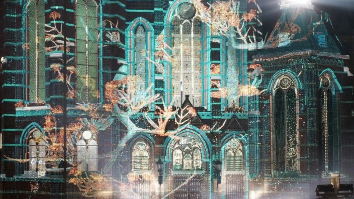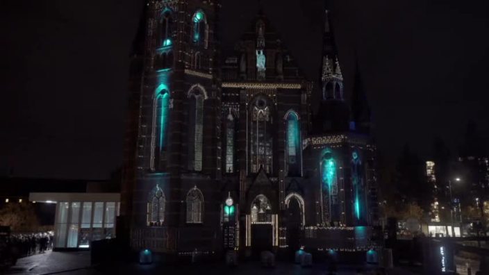 《DOMUS LUMA》是艺术团队ANIMA LUX专为荷兰埃因霍温奥古斯丁教堂(Augustijnenkerk church)打造的建筑投影项目。为实现视觉融合效果,作品对建筑表面石料即具体投影范围进行精密化校准,通过结合投影、灯光和激光追求创新和诗意的叙事。团队尽可能地刻画了教堂外立面50000块石头的线条、曲线与体积,让流动的投影画面与建筑实体贴合,仿佛光影是从建筑本身“生长”而出。所有动画均由ANIMA LUX团队成员、艺术家 Yann Nguema开发定制的软件生成,使得数字的建筑构造以完全独特的方式生成。光和激光的附加提供了光的调色板,使投影光效更完整,为作品注入了超越传统投影的全新美感。