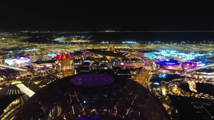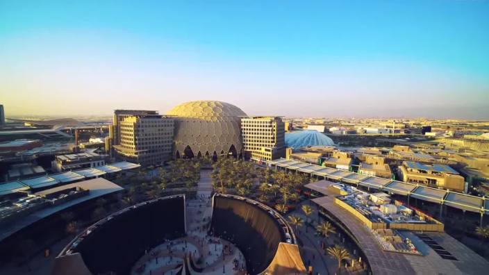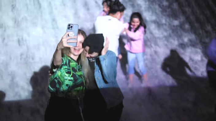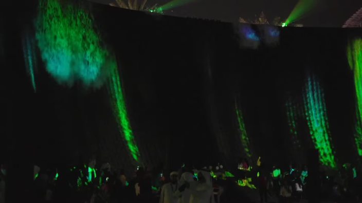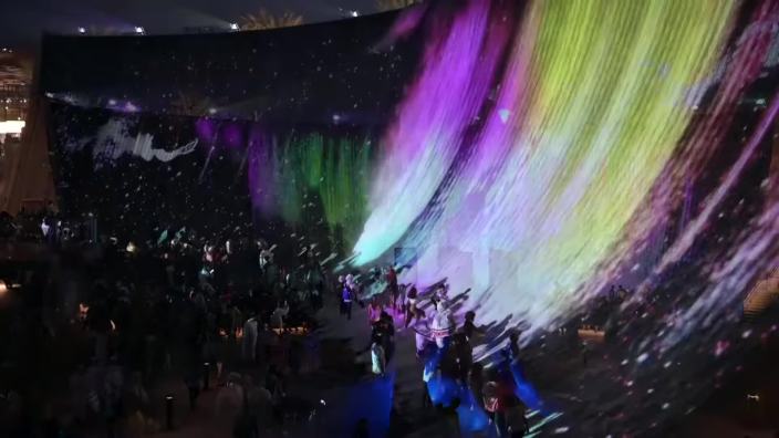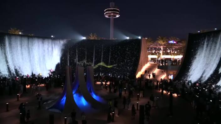 在2020年迪拜世博会上,一座四层楼高的“超现实”瀑布景观装置《Surreal》让游客沉浸式体验了一把在科技版的“人在水中游”的奇妙感受。该装置由美国洛杉矶水景设计公司WET Design打造,与常规向上喷射的喷泉形式不同的是,它以模拟瀑布自上而下流淌的姿态,凭借极具冲击力的“反重力”视觉效果走红世界,被誉为迪拜世博会的标志性地标之一。装置核心由153条灵动舞动的水波构成,站在瀑布前,倾泄而下的水流似乎马上要将人吞没,但忽然之间又消失在人脚下,会给人一种瀑布倒流的错觉。设计的核心是将水、火、土的元素结合在一起,为此喷泉中央还设有一个巨大的螺旋雕塑,红色、绿色与黄色的火焰在其中跃动。当水流从喷泉顶端倾斜而下时,中央的螺旋雕塑就会升起火焰,营造出出一种水火共生的效果。
