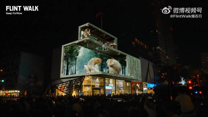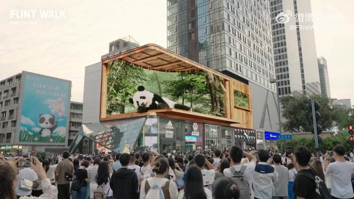 成都春熙路远洋太古里的裸眼3D大屏于2020年10月前后建成,其屏体面积约888平方米,分辨率可达8K,凭借超高清晰度与震撼视觉效果成为成都商圈标志性科技装置。大屏首次打造的“裸眼3D飞船”视频,让宇宙飞船在头顶盘旋,赛博朋克意味十足、极具视觉冲击力。视频一经上线便掀起现象级爆火热度,仅在微博平台相关内容阅读量就突破3.2亿,成功吸引了全国关注。此后推出的“熊猫献礼”系列视频同样备受市民喜爱,两只憨态可掬的裸眼3D大熊猫从卧龙保护区来到了城市腹地,也是自然生灵与人类的一次惊喜互动。这块大屏迅速跃升为成都新晋网红打卡地,吸引了大批市民和游客前去观看。