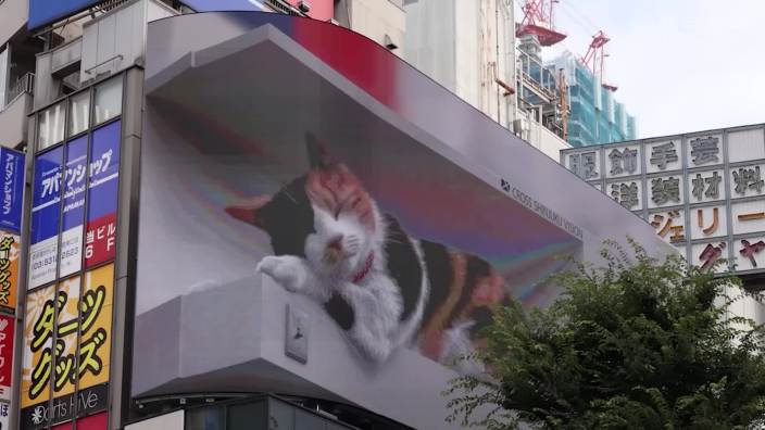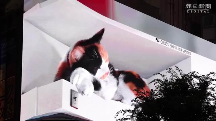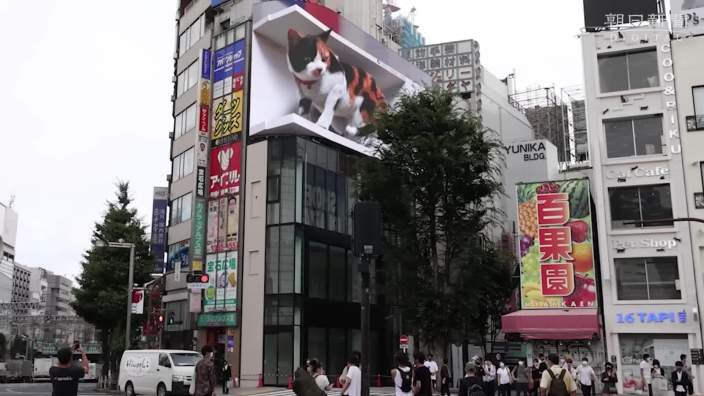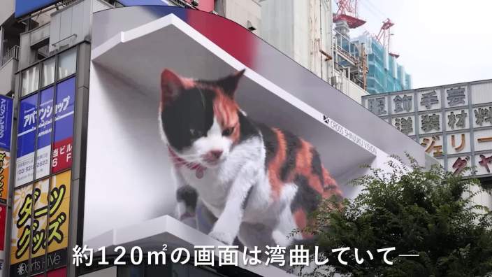 位于日本东京新宿车站东口广场クロス新宿ビジョン(Cross Shinjuku Vision)大楼外的裸眼3D大屏高16.5米、宽15.3米,总面积约252平方米,是新宿商圈极具辨识度的视觉地标。大屏自2018年正式启用以来持续吸引着往来人群的目光,初期以高清动态画面吸引关注,后续通过技术升级强化裸眼3D效果,逐渐成为新宿“科技+艺术”融合的标志性装置。2021年,这面大屏迎来了一只栩栩如生的裸眼3D三花猫,犹如一只庞大的真猫盘踞在高楼上,一举一动都万分灵动。每天猫咪的“作息”与大屏启停完全同步:早上7点随着屏幕的准时开启,这只三花猫也会睁开惺忪睡眼,发出喵喵的叫声。;接下来的时间里,屏幕会依照不同时序呈现猫咪的一天,例如打瞌睡、梳理毛发、摇头摆尾和路人互动等;直到凌晨一点,随着猫咪昏昏沉沉地陷入睡梦时,屏幕也会准时熄灭,为一天的“陪伴”画上句号。