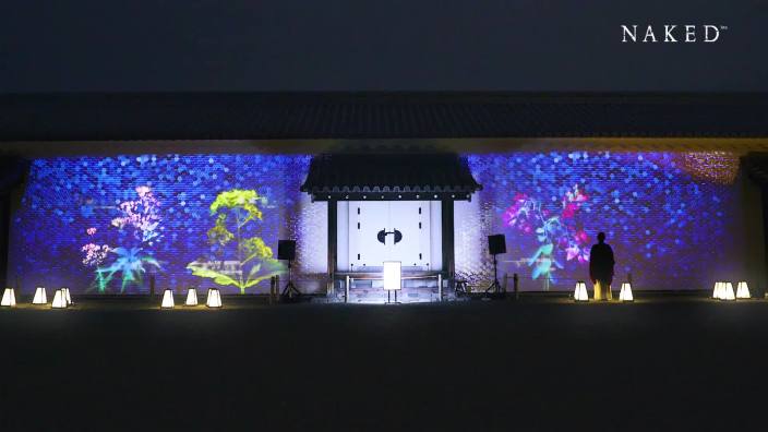 世界文化遗产京都二条城曾是幕府将军在京都的行辕,承载着深厚的历史底蕴,数字艺术团队NAKED.INC将大型沉浸式艺术光雕表演“搬进”夜晚的二条城,通过虚拟现实技术与全息投影等多元科技手段为游客呈现了一个打破次元壁的梦幻世界。 原本画在唐门上的静态凤凰在数字技术的加持下,被生动地投影在城门与地面上,化作展翅飞翔的“向导”迎接来往的游客。游客还可通过手机参与多重互动体验,例如在线下,游客可以通过手机参与一期一会的数字插花,并让作品实时呈现在墙面投影上;在线上元宇宙空间里,游客可以在池坊专好氏的虚拟插花作品基础上共创永不凋谢的虚拟作品。此外会场内还设有贩卖本地特色美食的摊贩,游客在沉浸于科技艺术的同时还能品尝风味小吃,感受丰收季节的烟火气息。