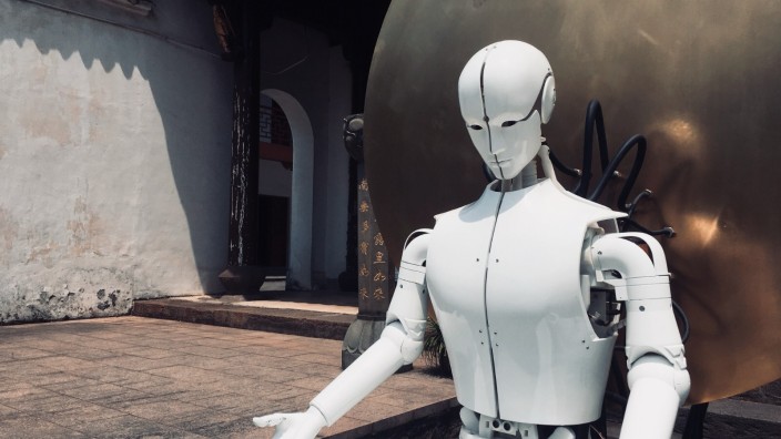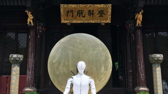 《耕魂乙》GROW SOUL-B是新媒体艺术家林万山于2019年创作的“赛博佛观”作品,是一件混合了宗教、技术物、生命体的多维作品——未来的宗教形态将会呈现出怎样的独特形式。林万山的作品《耕魂乙》作为其未来宗教形态第三阶段的作品,机器人能够根据提示词“色,受,想,行,识,空”的识别,以及超声波的位置感应触发出不同的动作。作品创作的意义是在思考——技术物是否有一日能够成为人类的精神导师,即技术物通过自身的迭代成长,是否能够实现终极进化,从而开悟,既成“佛”。而这件作品的起始灵感,源自林万山一次与师傅的对谈:“人工智能能否成佛?”师傅的答案是不可,因技术物无自信;而他的一位朋友则认为,技术物有可能成为神,但物不能成为人的神,它会成为技术物自己的神。林万山本人也没有答案,因此他期望去创作一件《耕魂乙》这样的作品,从构思到筹备加工落地总共用了快一年的时间,去观察一个未知的可能将可能有何种反馈。装置本身在最后一块背板上是一块小型 LED 显示器,显示的是圣经中第一句:混沌初始,神创天地。林万山期望借此回归“神”的意义,即高层级智能造物者,而非某个特定宗教的文化符号;期望恢复场域的意义,不过空间、我、智能、位置、血肉,如是而已。