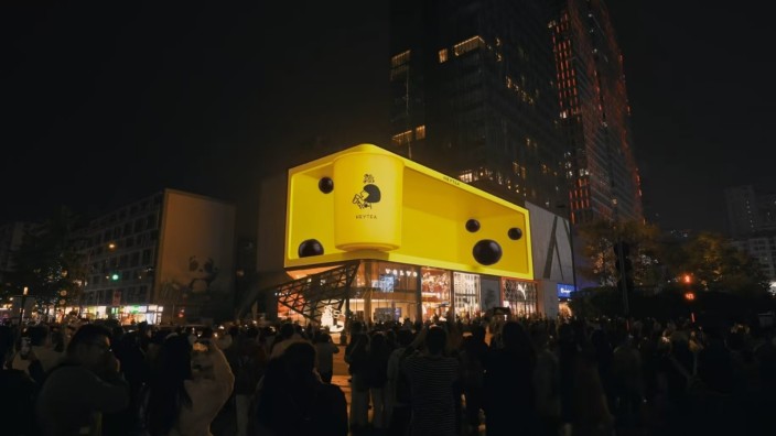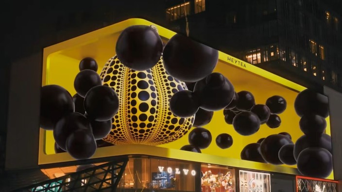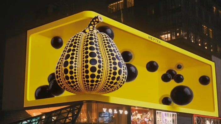 2024年11月7日,喜茶与草间弥生的合作震撼上线。上线当日在成都太古里盈嘉·嬴家裙楼外墙限时上映的裸眼3D视频《波波出逃记》,为合作进行了生动的预热。「喜茶×草间弥生」梦幻联动的裸眼3D作品由FlintWalk燧石行团队创作:象征着“爱、生命与和平”的南瓜,从喜茶的饮品杯中破壁而出,被包裹在Q弹软糯的波波里,跳跃、流动,还原了吮吸奶茶波波那一刻的快乐,营造出超越视觉的奇趣体验。波波就是爱的最小单位,喜茶和草间弥生一起“给世界加点波波”,感受爱与治愈的力量的同时,黄色与小黑点搭配视觉冲击力效果拉满。这次联名双方将草间弥生标志性的波点艺术与喜茶首创的新茶饮经典元素波波结合,带来一场新茶饮联动史上最具艺术性的合作。据称,这也是草间弥生在95岁之际,首次跨界合作中国新茶饮品牌并带来全球范围的合作。