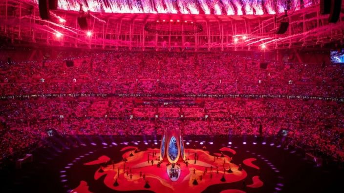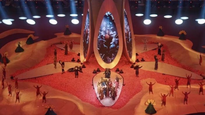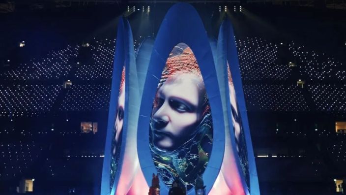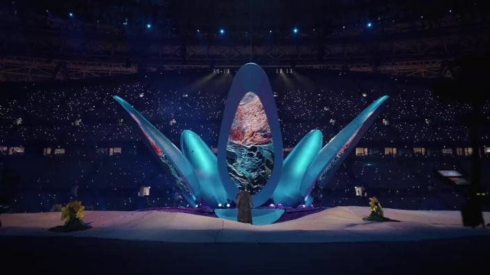 2024年1月12日,由SILA SVETA工作室和Katara Studios联合打造的亚洲足球联合会(AFC)亚洲杯开幕式在卡塔尔盛大举行。开幕式场地为可容纳88000名观众、面积近20万平方米的场馆,是亚洲杯历史上规模最大的比赛场馆之一。舞台布景以沙丘、巨型贝壳状屏幕、粉色花瓣为主,金色沙漠象征着阿拉伯世界,铺满鲜花的山丘向象征亚洲的玉兰和樱花致敬,两只聪明的豺狼诉说属于他们的古老故事,赞美了亚洲多元文化、超越国界和语言的深厚友谊。舞台中央的五个贝壳形屏幕最为夺目,每个屏幕高度达12米,由600个LED面板组成,能实现360度视角展示。它们宛如五枚巨大花瓣,可灵活绽放与闭合、“打开”舞台空间,这种动态的舞台为观众带来意外的惊喜。整个开幕式表演为25分钟,一众优秀的艺术家上演史诗般的亚洲故事,全方位展现亚洲文化的多元魅力。