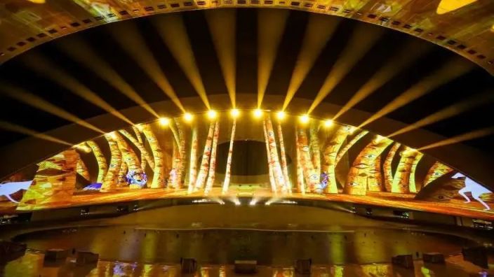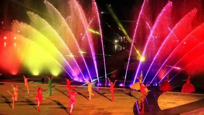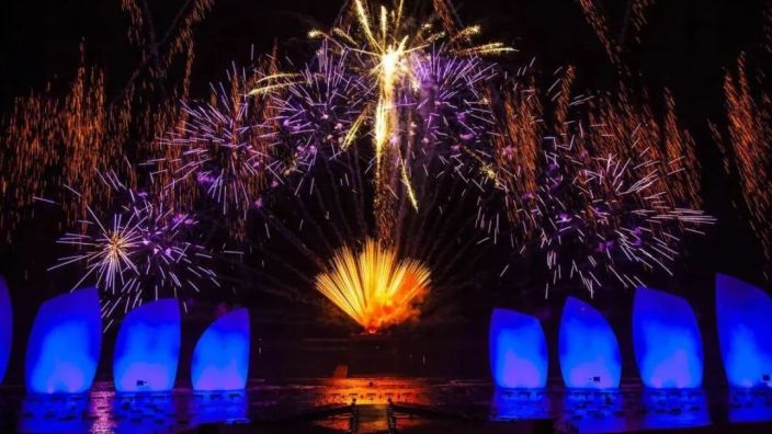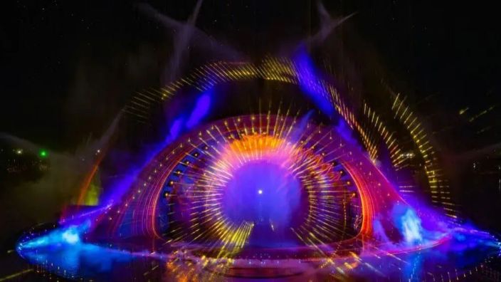《拥吻星辰》是法国知名水秀演出制作团队ECA2在越南富国岛海岸打造的一场演员与多媒体融合驻场水秀演出。该演出于2022年12月24日开启试营业,并在2023年初迎来盛大开演。演出在悠闲的海滨度假胜地日落小镇上演,,1000平方米的瀑布屏直接“落入海中”,巨大的拱门装置叠加各种精彩纷呈的多媒体效果,讲述小镇少年和外星少女的爱情故事。演出设置了一个30米高、65米宽的主拱门,4个控制水位的水池,特效达到50至60米高、120米宽。整场演出以壮阔的海水为天然背景,围绕“爱情与星空”的核心主题展开。火与水的特效交织,设计与叙事紧密交融,为观众留下了难忘的回忆。