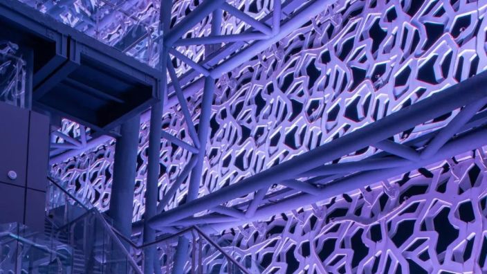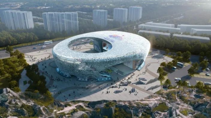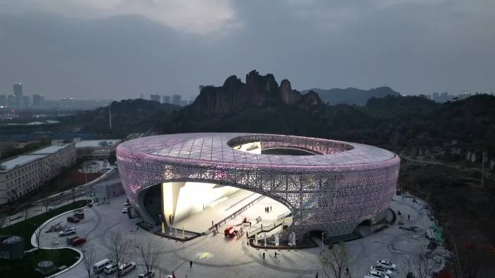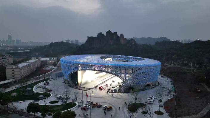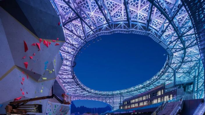 绍兴市柯桥羊山攀岩中心是第19届杭州亚运会攀岩比赛场馆,是杭州亚运会唯一获得建筑特色奖的场馆,也是国际上第一座赛事功能完备、永久性的攀岩比赛场馆。羊山攀岩中心原本只是个废弃矿坑,如今却摇身一变成为国内目前最大的单体异形镂空UHPC(超高性能混凝土)挂板建筑,入围2023WAF世界建筑节,荣获浙江省优秀勘察设计一等奖、2022金拱奖体育建筑设计金奖、中照照明奖一等奖。晶莹剔透的“蚕茧”建筑造型,既体现了杭州“丝绸之府”的亚运城市特色,又突出绍兴柯桥“国际纺都”的地域文化特点,诠释了“岩壁上的芭蕾”这一攀岩运动刚柔并济的美学特质,也是对攀岩运动健儿破茧成蝶,精彩绽放的美好祝愿,更是寓意羊山公园重生蝶变的发展历程。灯光结合建筑“蚕茧”的造型,以“梦想的摇篮”为设计主题,用光为造梦者添油加彩,用光为追梦者创造舞台,用光为圆梦者欢呼呐喊。
