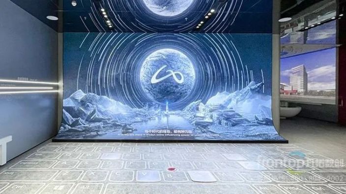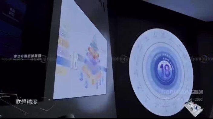 凡拓数创团队为联想南方基地量身策划“联想智造,让智能被看见”主题,打造5大展区19个数字展项,以智造科技为基础,将创意融入产品展示,解决“将联想的智造信息精准传达”的核心诉求,展厅荣获2023美国国际创新设计大奖——创新设计奖。凡拓数创团队对展陈内容经过了90%的内容视觉重建,将大量的文本图形化处理,通过可视化的方式直观地传达核心信息。序厅全沉浸式的空间带观众从现实走入智造世界,地面还原键盘造型,随着观众的脚步脚踩红点感应,无数的数据球将能量源源不断地输送至主屏幕,整体空间随之被激活。“联想精度”展区内有多种展示方式,组合形成联动展项,是全馆落地交互中层级最多、内容最复杂专业的展项。凡拓数创团队基于行业特点打造开放兼容、灵活可靠、实时更新迭代的“0展板”数字化空间。